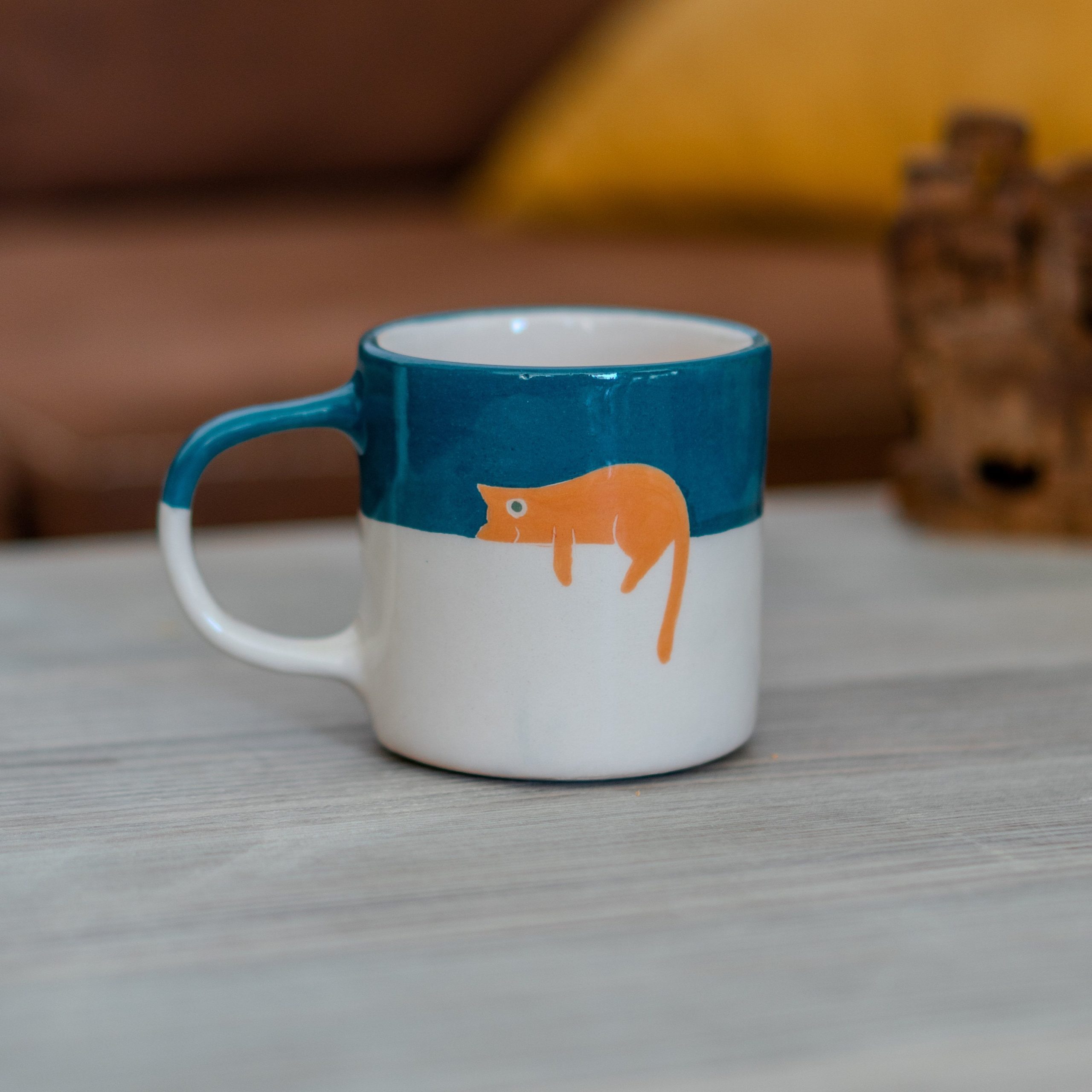 Handmade ceramic mug with cat design