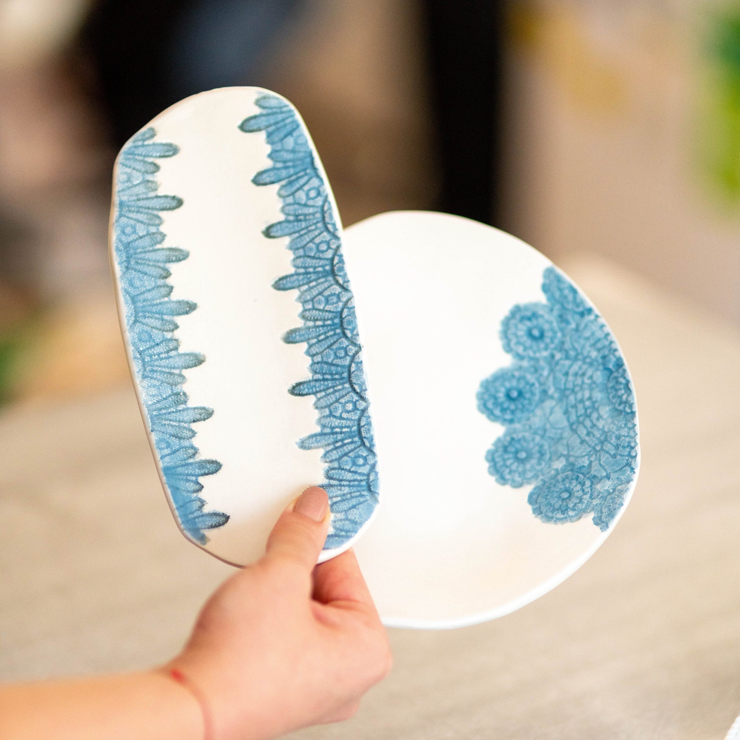 lace pattern plate set, handmade ceramic dinnerware, baby blue summer plates, ceramic plate set, elegant dinnerware, handmade tableware, lace design, artisanal ceramic plates, unique gift for special occasions