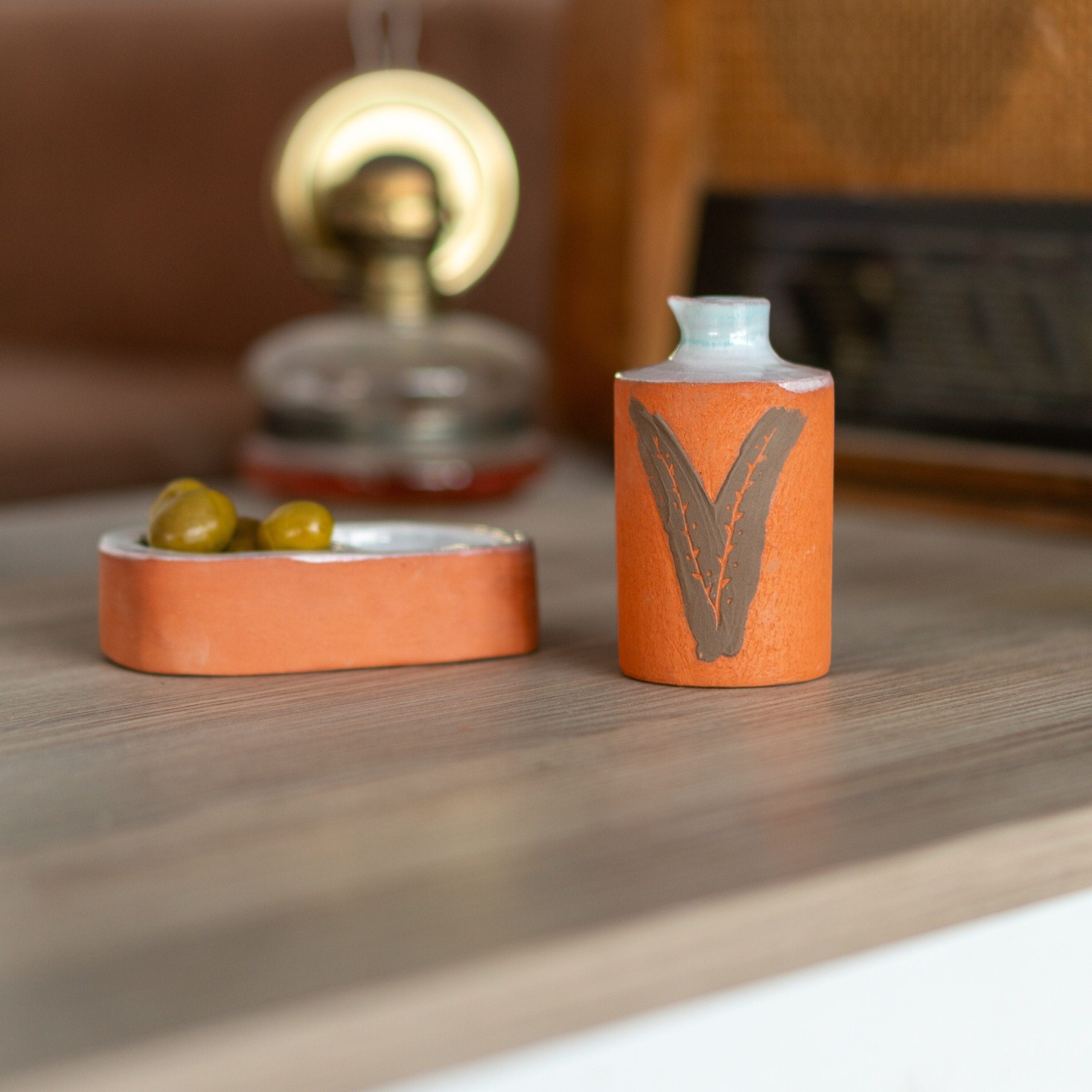 Elevate Your Kitchen with Artisan Elegance: Handmade Olive Oil Bottle and Olive Dish Set