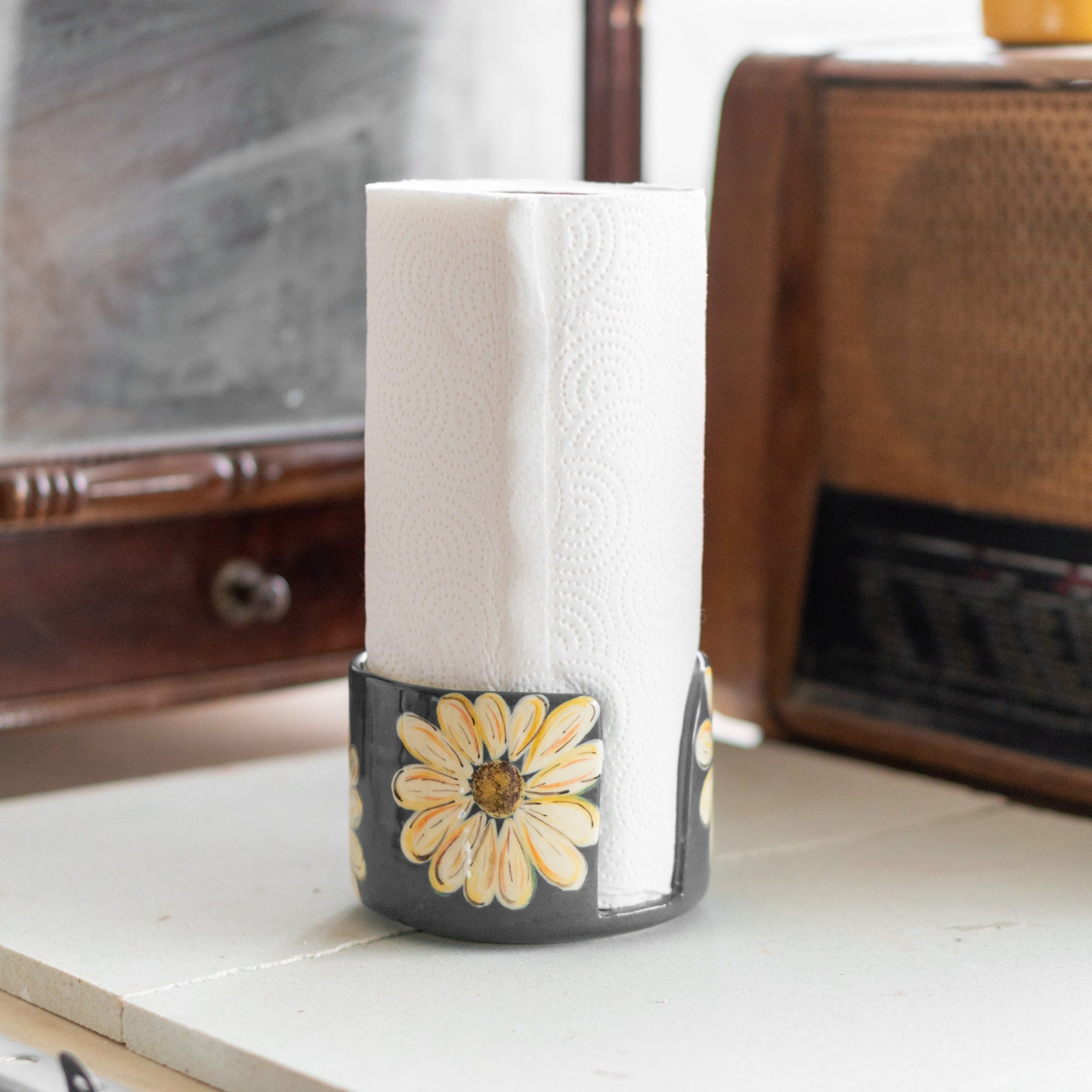 This paper towel holder is not merely an item but an integral piece of your decor, elevating your environment with its distinctive daisy design while offering everyday convenience.