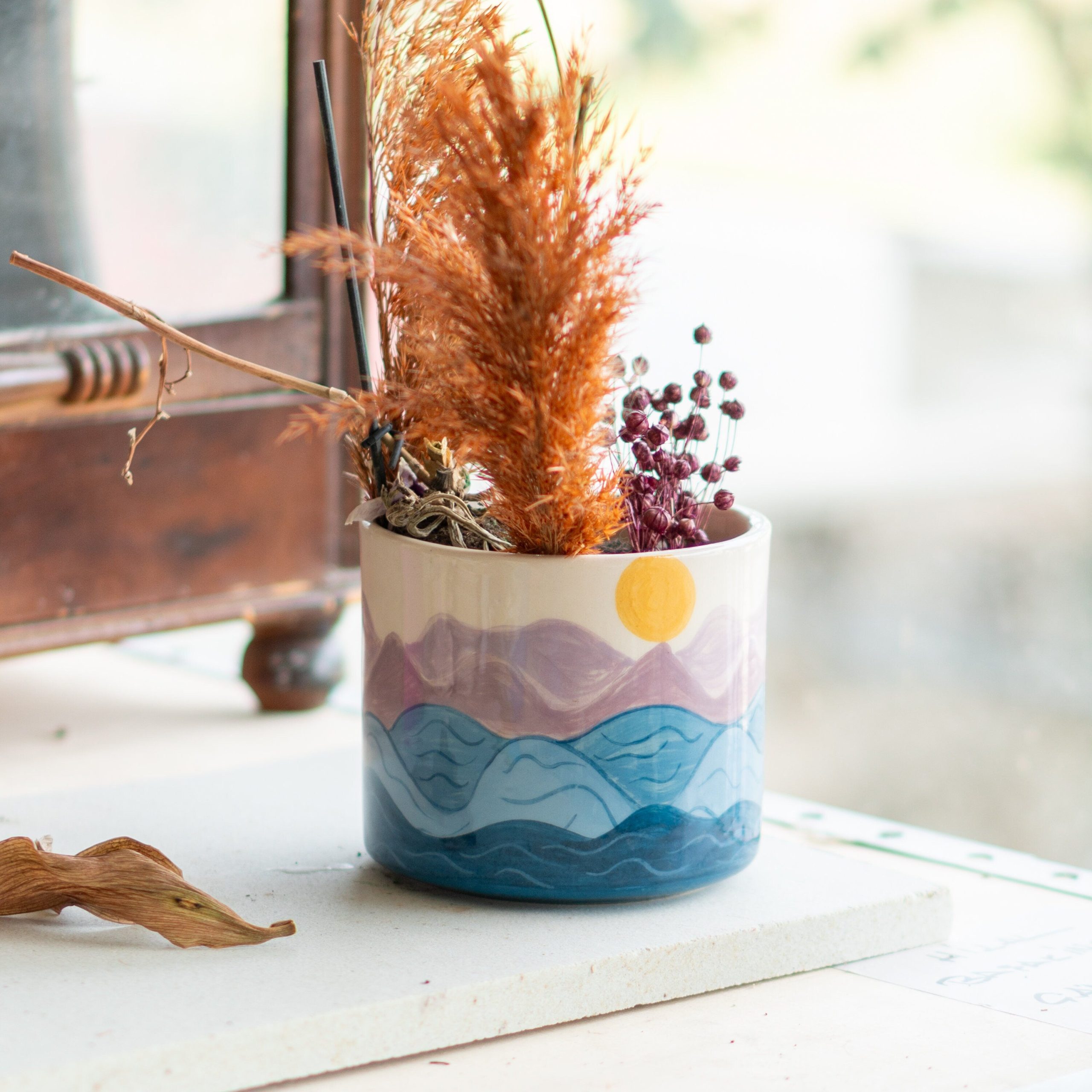 Immerse yourself in the tranquil beauty of ocean waves and the warmth of the sun with our handcrafted Unique Planter Ceramic Flower Pot. This exquisite piece, inspired by the serene sea and sun theme, is more than just a flower pot; it’s a tropical decor delight that breathes life into any space. Perfect for those who cherish coastal decor, beach decor, and a touch of boho charm.